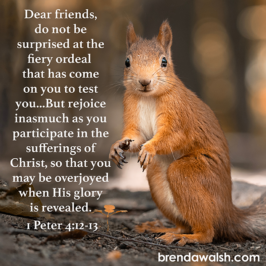 1 Pedro 4:12-13 – Hermanos, no se extrañen del fuego de la prueba que están soportando… Al contrario, alégrense de tener parte en los sufrimientos de Cristo, para que también sea inmensa su alegría cuando se revele la gloria de Cristo.